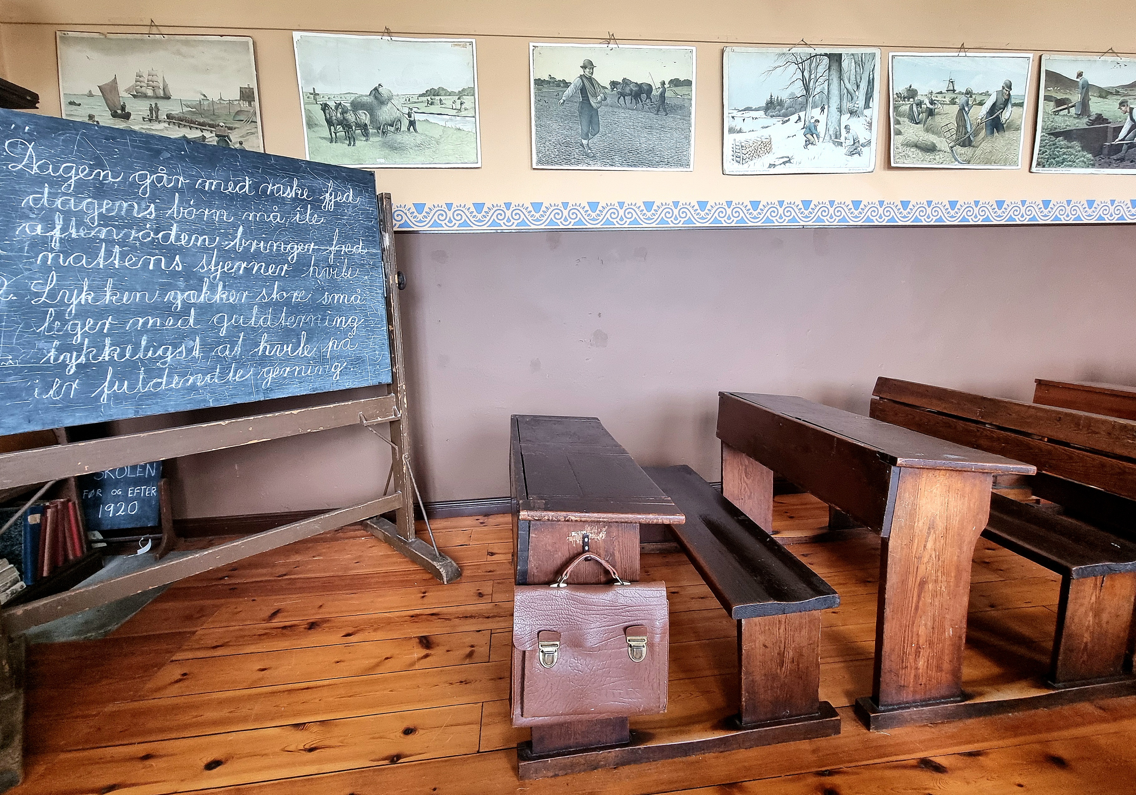 Engang husede skolestuen på 60 kvadratmeter op mod 64 elever fra 1. til 7. årgang. I dag rummer den 30 børn ved pultene og på bænkene, hvor børn af i dag på besøg undervises som i gamle dage.